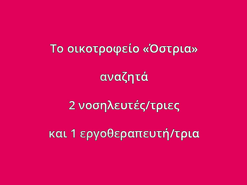 Αναζητούνται 2 νοσηλευτές/τριες και 1 εργοθεραπευτής/τρια για το οικοτροφείο «Όστρια» στον Πειραιά