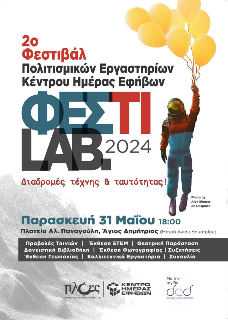 Το Κέντρο Ημέρας Εφήβων του φορέα “Πλόες” – ΕΨΥΜΕ διοργανώνει το 2ο Φεστιβάλ Πολιτισμικών Εργαστηρίων “ΦΕΣΤΙLAB 2024”, την Παρασκευή 31 Μαΐου 2024, στις 18:00, με δωρεάν είσοδο, στην πλατεία Αλ. Παναγούλη στον Άγιο Δημήτριο (μετρό Αγ.Δημητρίου). Οι έφηβοι και οι έφηβες συνεργάζονται, ανακαλύπτουν τον πολιτισμό και την τέχνη και δημιουργούν μέσα από τις ομάδες.