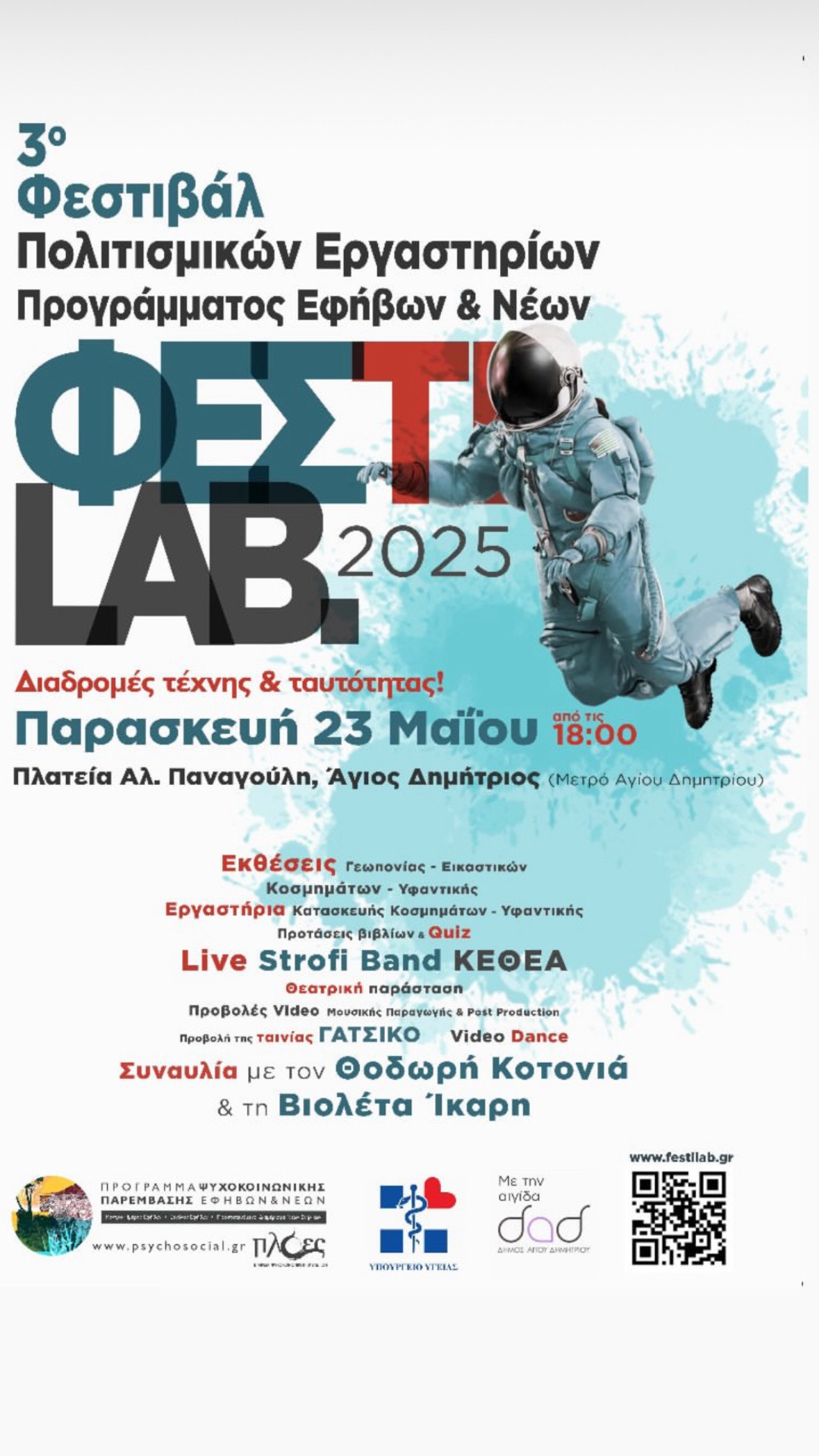 Το Πρόγραμμα Ψυχοκοινωνικής Παρέμβασης Εφήβων και Νέων του φορέα «Πλόες» ΕΨΥΜΕ, διοργανώνει το 3ο Φεστιβάλ Πολιτισμικών Εργαστηρίων ΦΕΣΤΙLAB 2025, την Παρασκευή 23 Μαΐου 2025, στις 18:00, με δωρεάν είσοδο, στην πλατεία Αλ. Παναγούλη στον Άγιο Δημήτριο (πλησίον μετρό Αγίου Δημητρίου). Οι έφηβοι και οι έφηβες συνεργάζονται, ανακαλύπτουν τον πολιτισμό και την τέχνη και δημιουργούν συλλογικά έργα, μέσα τη συμμετοχή τους στα Πολιτισμικά, τα Κοινοτικά και τα Παραγωγικά Εργαστήρια.
