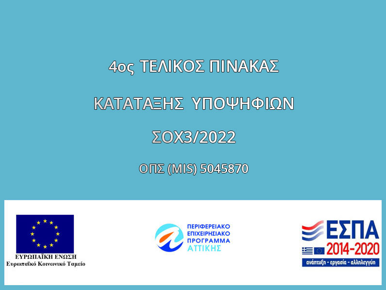 4ος ΤΕΛΙΚΟΣ ΠΙΝΑΚΑΣ ΚΑΤΑΤΑΞΗΣ ΥΠΟΨΗΦΙΩΝ ΤΗΣ ΣΟΧ3/2022 για την Πράξη με MIS 5045870