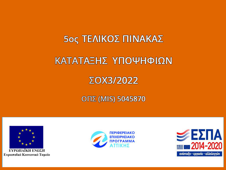5ος ΤΕΛΙΚΟΣ ΠΙΝΑΚΑΣ ΚΑΤΑΤΑΞΗΣ ΥΠΟΨΗΦΙΩΝ ΤΗΣ ΣΟΧ3/2022 για την Πράξη με MIS 5045870