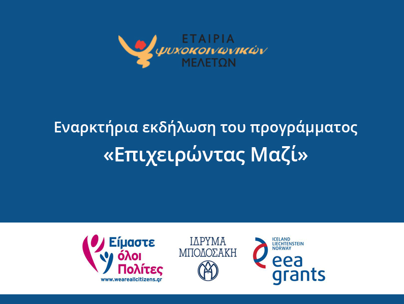 Η Εταιρία Ψυχοκοινωνικών Μελετών, με συγκρατημενη αισιοδοξία και κυρίως με διάθεση για δράση, σας προσκαλεί στην εναρκτήρια εκδήλωση του προγράμματος «Επιχειρώντας Μαζί». Το έργο εντάσσεται στην Πρόσκληση «Προαγωγή των δημοκρατικών αξιών, συμπεριλαμβανομένων των ανθρωπίνων δικαιωμάτων» του Προγράμματος «Είμαστε όλοι Πολίτες», που είναι μέρος του συνολικού Χρηματοδοτικού Μηχανισμού του Ευρωπαϊκού Οικονομικού Χώρου (ΕΟΧ) και το διαχειρίζεται το Ίδρυμα Μποδοσάκη.