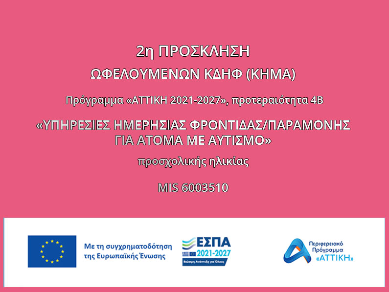 Η ΑΣΤΙΚΗ ΕΤΑΙΡΕΙΑ ΨΥΧΟΚΟΙΝΩΝΙΚΩΝ ΜΕΛΕΤΩΝ (Ε.ΨΥ.ΜΕ.) στο πλαίσιο του Εθνικού Στρατηγικού Πλαισίου Αναφοράς (ΕΣΠΑ) για την προγραμματική περίοδο 2021-2027, Πρόγραμμα «ΑΤΤΙΚΗ 2021-2027», προτεραιότητα 4B – Προώθηση της περιφερειακής κοινωνικής συνοχής μέσα από την ενίσχυση των μηχανισμών και υπηρεσιών για την στήριξη του ανθρώπινου δυναμικού, της απασχόλησης, της εκπαίδευσης, της υγειονομικής περίθαλψης, της κοινωνικοοικονομικής ένταξης, της ισότητας των ευκαιριών και την αντιμετώπιση κινδύνων φτώχεια, με τη συμμετοχή του ΕΚΤ+, Δράση 4.11.10.1.- Κέντρα Διημέρευσης Ημερήσιας Φροντίδας [ΚΔΗΦ] Ατόμων με Αναπηρία, λειτουργώντας ως δικαιούχος της πράξης «ΥΠΗΡΕΣΙΕΣ ΗΜΕΡΗΣΙΑΣ ΦΡΟΝΤΙΔΑΣ/ΠΑΡΑΜΟΝΗΣ ΓΙΑ ΑΤΟΜΑ ΜΕ ΑΥΤΙΣΜΟ», με κωδικό MIS 6003510