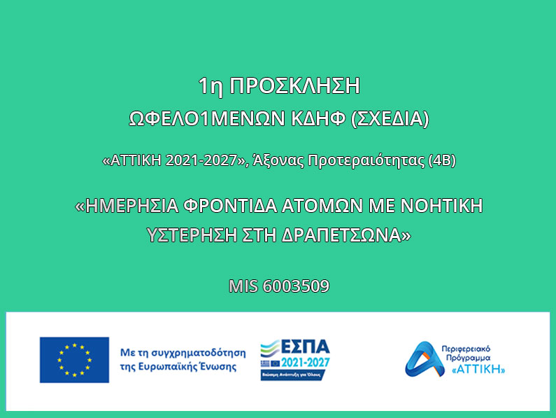 Η ΑΣΤΙΚΗ ΕΤΑΙΡΕΙΑ ΨΥΧΟΚΟΙΝΩΝΙΚΩΝ ΜΕΛΕΤΩΝ «ΠΛΟΕΣ» (Ε.ΨΥ.ΜΕ.) στο πλαίσιο του Εθνικού Στρατηγικού Πλαισίου Αναφοράς (ΕΣΠΑ) για την προγραμματική περίοδο 2021-2027, Πρόγραμμα «ΑΤΤΙΚΗ 2021-2027», προτεραιότητα 4B – Προώθηση της περιφερειακής κοινωνικής συνοχής μέσα από την ενίσχυση των μηχανισμών και υπηρεσιών για την στήριξη του ανθρώπινου δυναμικού, της απασχόλησης, της εκπαίδευσης, της υγειονομικής περίθαλψης, της κοινωνικοοικονομικής ένταξης, της ισότητας των ευκαιριών και την αντιμετώπιση κινδύνων φτώχεια, με τη συμμετοχή του ΕΚΤ+, Δράση 4.11.10.1.- Κέντρα Διημέρευσης Ημερήσιας Φροντίδας [ΚΔΗΦ] Ατόμων με Αναπηρία, λειτουργώντας ως δικαιούχος της πράξης «ΗΜΕΡΗΣΙΑ ΦΡΟΝΤΙΔΑ ΑΤΟΜΩΝ ΜΕ ΝΟΗΤΙΚΗ ΥΣΤΕΡΗΣΗ ΣΤΗ ΔΡΑΠΕΤΣΩΝΑ», με κωδικό MIS 6003509